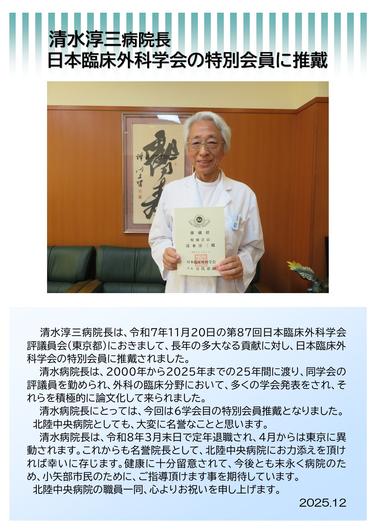 清水淳三 病院長 日本臨床外科学会の特別会員に推戴